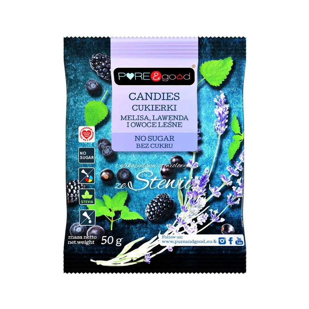 Cukierki melisa, lawenda i owoce leśne bez cukru ze stewią - PURE&good, 50g