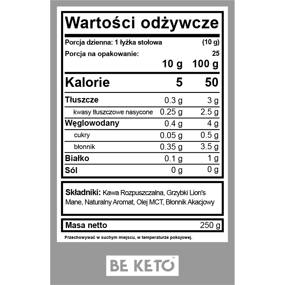 Składniki: kawa rozpuszczalna, grzybki Lion's Mane, naturalny aromat, olej MCT, błonnik akacjowy.