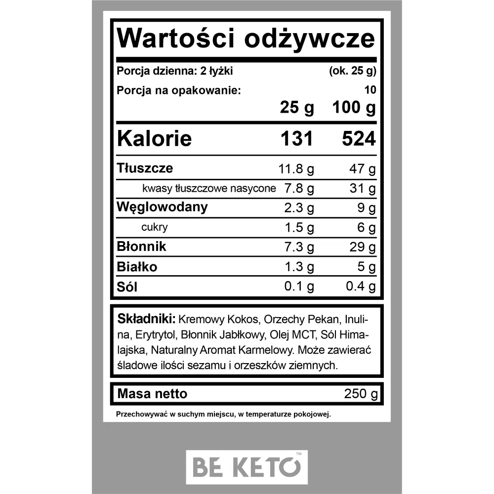 Składniki: kremowy kokos, orzechy pekan, inulina, erytrytol, błonnik jabłkowy, olej MCT, sól himalajska, naturalny aromat karmelowy.