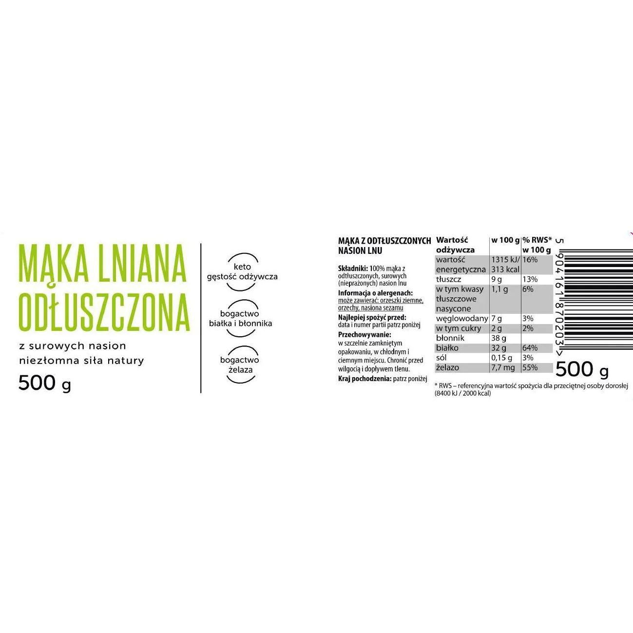 Mąka lniana zawiera niezwykle cenne minerały i wartości odżywcze. Odtłuszczona mąka lniana ma wysoką zawartość błonnika pokarmowego (38 g błonnika w 100 g) oraz jest nieocenionym źródłem śluzów, które wspomagają układ trawienny oraz odpowiadają za właściwości wiążące mąki. Dodatkowo mąka lniana bogata jest w żelazo oraz białko, dzięki czemu przyczynia się do wzrostu i utrzymania masy mięśniowej oraz utrzymania zdrowych kości. Len mielony jest również źródłem wapnia, który nie tylko pomaga w prawidłowym funkcjonowaniu mięśni, ale również pomaga w utrzymaniu prawidłowego przekaźnictwa nerwowego.