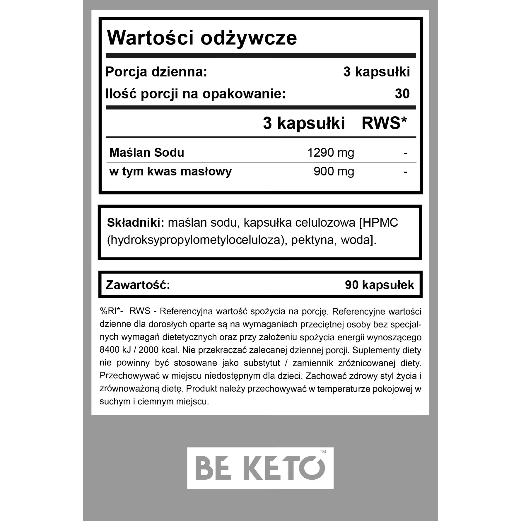 Maślan sodu w kapsułkach - Sodium Butyrate - BeKeto, 90 kapsułek