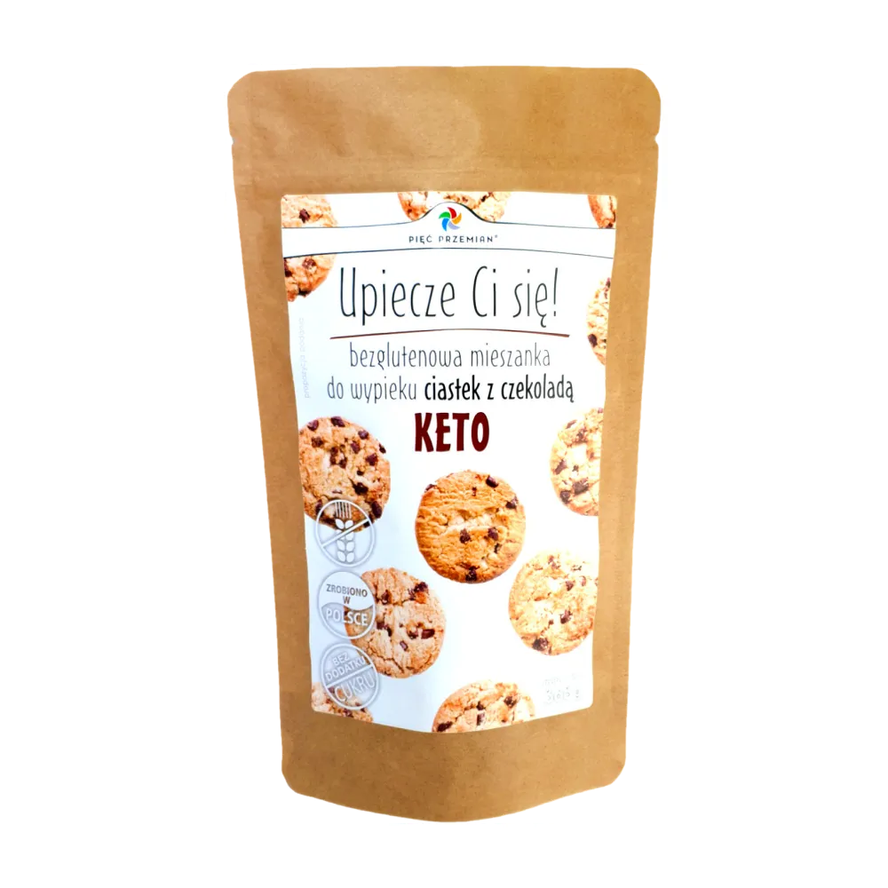 Mieszanka do wypieku KETO ciastek z czekoladą, bezglutenowa firmy Pięć Przemian to idealna propozycja dla osób, które chcą cieszyć się smakiem pysznych ciastek, ale jednocześnie dbają o swoje zdrowie i stosują dietę keto lub low carb.