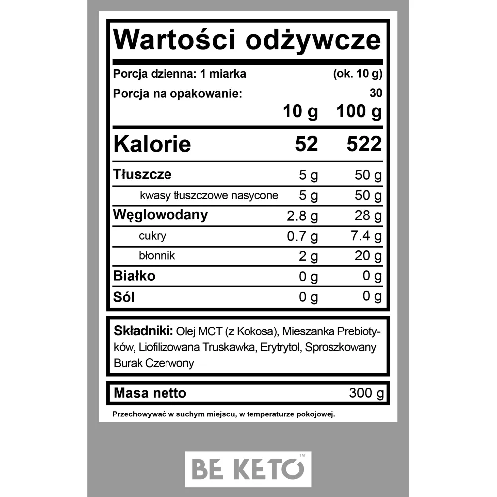 Składniki: olej MCT z kokosa, mieszanka prebiotyków, liofilizowana truskawka, erytrytol, sproszkowany burak czerwony.
